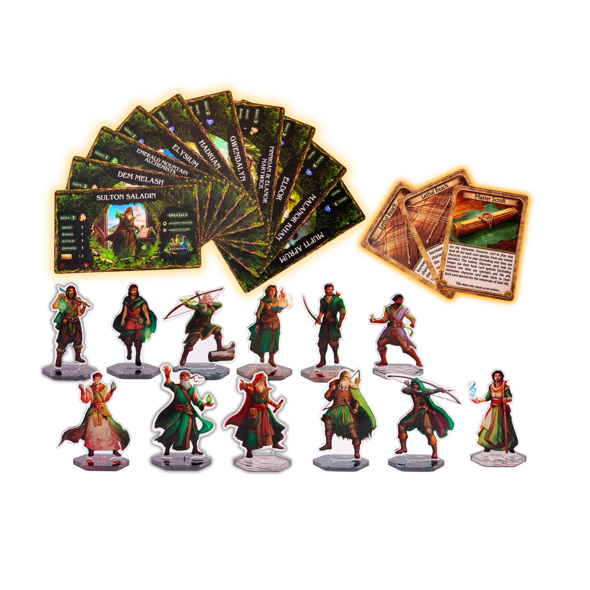 Alchemist Expansion for Barnburners and Noblemen. This expansion adds 10 brand new character cards to your set – each with a unique play-style. Alchemists have higher risk and reward centered specials, making them stand out amongst the other factions. Many Alchemists also use the green 8 sided die for certain specials. This expansion also adds 3 new and unique diplomacy cards. The box includes 12 acrylic standees, 3 new diplomacy cards, 10 character cards, and a felt bag for the standees.